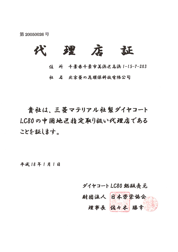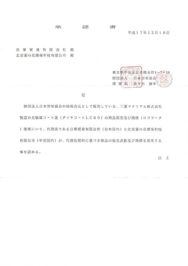 溫州泓創菱之花環??萍加邢薰臼侨毡救猊蕙匹辚ˉ?Dia Coat)光觸媒株式會社,(日本財團法人,日本勞榮協會)授權溫州市地區指定代理公司。